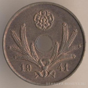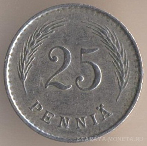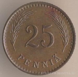 25 пенни 1942 года, медь, масса - 1,27 грамма, диаметр - 16 мм, толщина - 1,05 мм, тираж - 6464000 экземпляров. Гравёр: Исак Густав Санделл. Чеканились в 1940-43 годах.