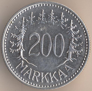 200 марок 1957 года, серебро 500-й пробы, масса - 8,3 грамма, диаметр - 27,5 мм, толщина - 1,8 мм, тираж - 2157000 экземпляров. Гравёр: Пейппо Уолеви Хелле. Монетный двор Хельсинки. Чеканились в 1956-59 годах.