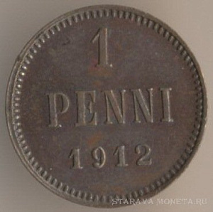 Великое Княжество Финляндское. 1 пенни 1912 года, медь, масса - 1,28 грамма, диаметр - 15 мм, толщина - 1 мм, тираж - 2450000 экземпляров. Гравёр: Александр Фадеев. Чеканились в 1895, 1898-1909 и 1911-16 годах.