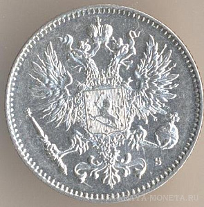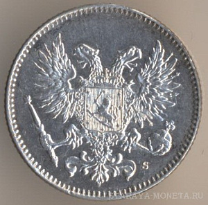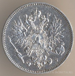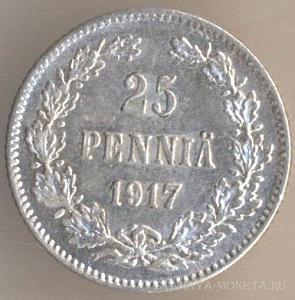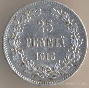 25 пенни 1916 года, серебро 750-й пробы, масса - 1,2747 грамма, диаметр - 16 мм, толщина - 0,9 мм, тираж - 6392000 экземпляров. Чеканились в 1865-69, 1871-73, 1875-76, 1889-91, 1894, 1897-99, 1901-1902, 1906-10, 1913 и 1915-17. Правление императора Николая II.