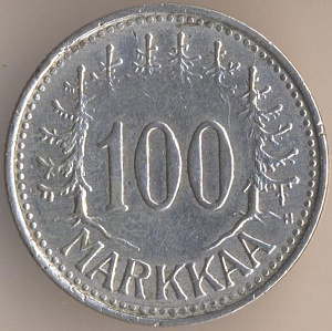 100 марок 1956 года, серебро 500-й пробы, масса - 5,3 грамма, диаметр - 24 мм, толщина - 1,7 мм, тираж - 3012000 экземпляров. Гравёр: Пейппо Уолеви Хелле. Монетный двор Хельсинки. Чеканились в 1956-60 годах.