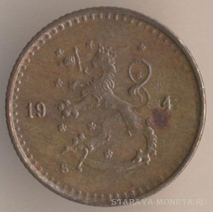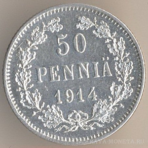 50 пенни 1914 года, серебро 750-й пробы, масса - 2,5494 грамма, диаметр - 18,6 мм, толщина - 1,2 мм, тираж - 600000 экземпляров. Чеканились в 1872, 1874, 1876, 1889-93, 1907-1908, 1911 и 1914-17. Правление императора Николая II.