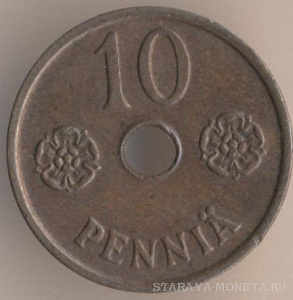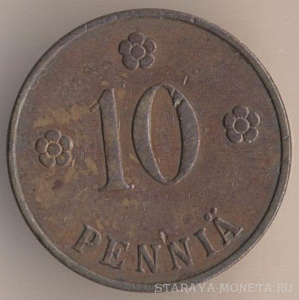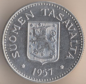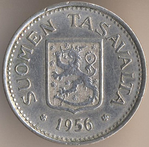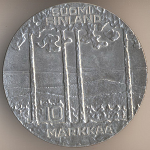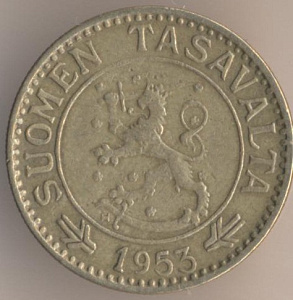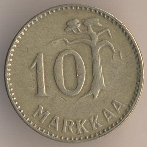 10 марок 1953 года. алюминиево-бронзовый сплав, масса - 3 грамма, диаметр - 19,9 мм, толщина - 1,5 мм, тираж - 22650000 экземпляров. Гравёр: Пейппо Уолеви Хелле. Чеканились в 1952--56, 1958 и 1962-62 годах.
