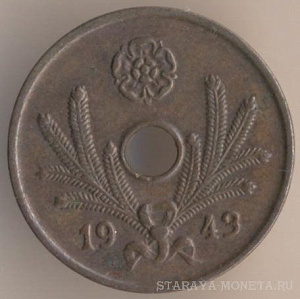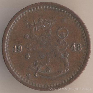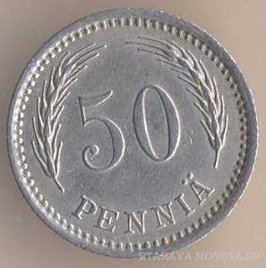 50 пенни 1943 года, медь, масса - 2,55 грамма, диаметр - 18,5 мм, толщина - 1,44 мм, тираж - 3140000 экземпляров. Гравёр: Исак Густав Санделл. Чеканились в 1940-43 годах.