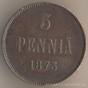 5 пенни 1873 года, медь, масса - 6,3 грамма, диаметр - 25 мм, толщина - 1,73 мм, тираж - 1000000 экземпляров. Чеканились в 1865-67, 1870, 1872-73 и 1875 годах. Правление императора Александра II (1855-1881).