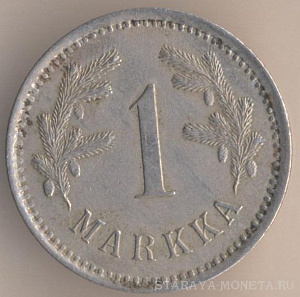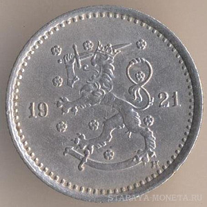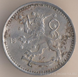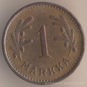 1 марка 1921 года, медно-никелевый сплав, масса - 5,1 грамма, диаметр - 24 мм, толщина - 1,5 мм, тираж - 10048000 экземпляров. Гравёр: Исак Густав Санделл. Хитонский монетный двор (Бирмингем, Великобритания). Чеканились в 1921 (Хитон) и 1922-24 (Хельсинки) годах.