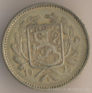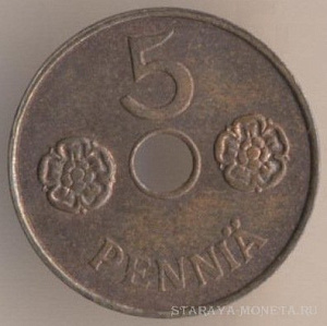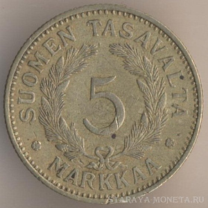 5 марок 1935 года, алюминиево-бронзовый сплав, масса - 4,5 грамма, диаметр - 23 мм, толщина - 1,7 мм, тираж - 436000 экземпляров. Гравёр: Исак Густав Санделл. Чеканились в 1928-33, 1935-42 и 1946 годах.