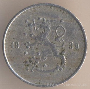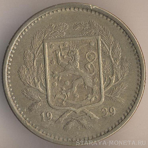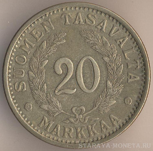 20 марок 1939 года, алюминиево-бронзовый сплав, масса - 13 граммов, диаметр - 31 мм, тираж - 960000 экземпляров. Гравёр: Исак Густав Санделл. Чеканились в 1931-32 и 1934-39 годах.