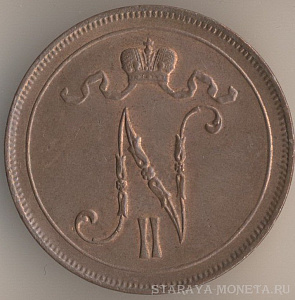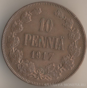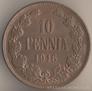 10 пенни 1916 года, медь, масса - 12,8 грамма, диаметр - 30 мм, тираж - 1952000 экземпляров. Чеканились в 1895-1900, 1905 и 1907-17 годах. Правление императора Николая II.