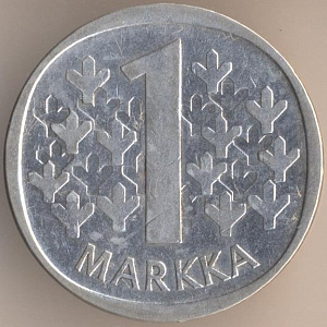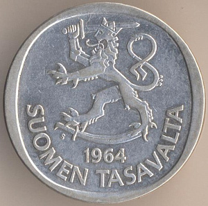 1 марка 1964 года. серебро 350-й пробы, масса - 6,4 грамма, диаметр - 24 мм, толщина - 1,7 мм, тираж - 9999000 экземпляров. Гравёр: Хейкки Хяйвяойя. Монетный двор Хельсинки.Чеканились в 1964-68 годах. В обращении до 31 декабря 1997 года.