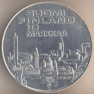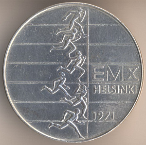 10 марок 1971 года, серебро 500-й пробы, масса - 24,2 грамма, диаметр - 35 мм, тираж - 1000000 экземпляров. Гравёр: Хейки Хайваойя. "Х Чемпионат Европы по лёгкой атлетике". Единственный выпуск.
