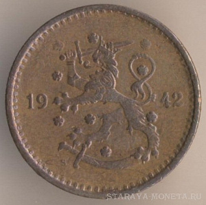 1 марка 1942 года, медь, масса - 4 грамма, диаметр - 21 мм, толщина - 1,6 мм, тираж - 11200000 экземпляров. Гравёр: Исак Густав Санделл. Чеканились в 1940-43 и 1949-51 годах.