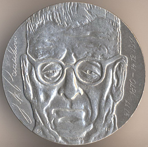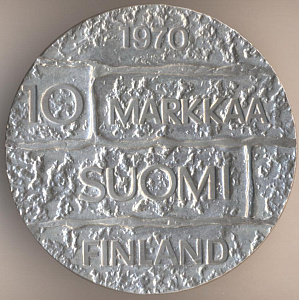 10 марок 1970 года, серебро 500-й пробы, масса - 22,75 грамма, диаметр - 35 мм, толщина - 2,8 мм, тираж - 600000 экземпляров. Гравёр: Хейки Хайваойя. "Столетний юбилей президента Паасикиви". Единственный выпуск.