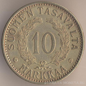 10 марок 1930 года, алюминиево-бронзовый сплав, масса - 8 граммов, диаметр - 27 мм, тираж - 260000 экземпляров. Гравёр: Исак Густав Санделл. Чеканились в 1928-32, 1934-39 года.