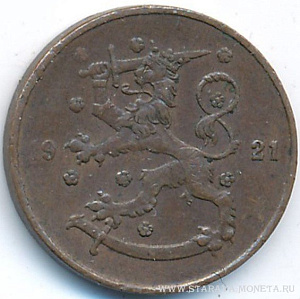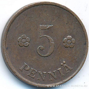 5 пенни 1921 года, медь, масса - 2,5 грамма, диаметр - 18 мм, толщина - 1,37 мм, тираж - 5910000 экземпляров. Гравёр: Исак Густав Санделл. Монетный двор Хельсинки. Чеканились в 1918-22, 1927-1930, 1932 и 1934-40 годах.