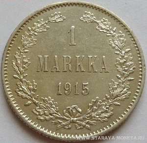1 марка 1915 года, серебро 868-й пробы, масса - 5,18 грамма, диаметр - 24 мм, тираж - 1212000 экземпляров. Монетный двор Хельсинки. Чеканились в 1872, 1874, 1890, 1892, 1893, 1907, 1908 и 1915 годах.