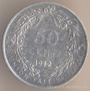 50 сантимов 1912 года, серебро 835-й пробы, масса - 2,5 грамма, диаметр - 18 мм, толщина - 1,3 мм, тираж - 1000000 экземпляров. Гравёр: Годфруа Девриз. Чеканились в 1910-12 и 1914 годах. Тип: легенда по-французски. В обращении до 30 июля 1932 года.