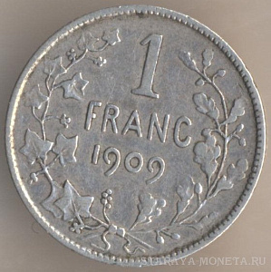 1 франк 1909 года, серебро 835-й пробы, масса - 5 граммов, диаметр - 23 мм, толщина - 1,45 мм, тираж - 2250000 экземпляров. Гравёр: Тома Винкотт. Чеканились в 1904 и 1909 годах. Тип: легенда по-французски. В обращении до 30 июля 1932 года.
