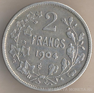 2 франка 1904 года, серебро 835-й пробы, масса - 10 граммов, диаметр - 27 мм, тираж - 400000 экземпляров. Гравёр: Тома Винкотт. Чеканились в 1904 и 1909 годах. Тип: легенда по-французски. В обращении до 30 июля 1932 года.