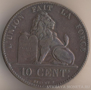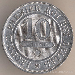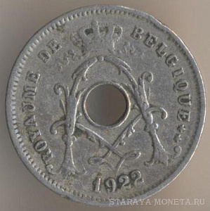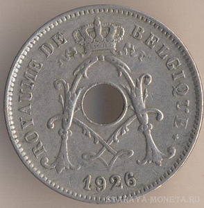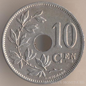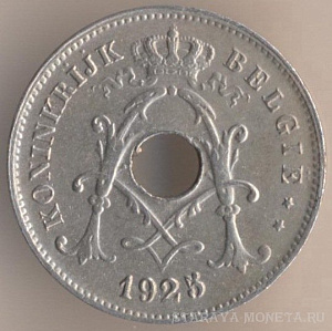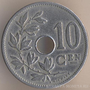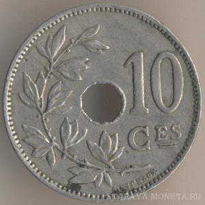 10 сантимов 1925 года, медно-никелевый сплав, масса - 4 грамма, диаметр - 22 мм, толщина - 1,4 мм, тираж - 8160000 экземпляров. Гравёр: Альфонс Мишо. Чеканились в 1911, 1920-22 и 1924-30 годах. Тип: легенда по-фламандски. В обращении до 29 декабря 1955 года.