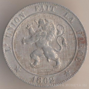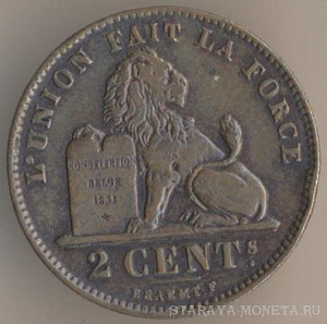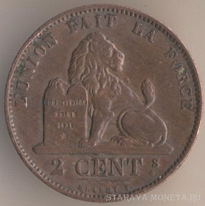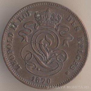 Леопольд II (1865-1909). 2 сантима 1870 года, медь, масса - 4 грамма, диаметр - 21,5 мм, толщина - 1,2 мм, тираж - 5653780 экземпляров. Гравёр: Жозеф-Пьер Брэмт. Чеканились в 1869-71, 1873-76, 1902, 1905 и 1909 годах.