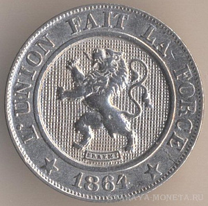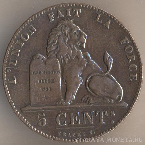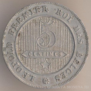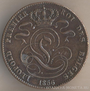 Леопольд I (1831-1865). 5 сантимов 1856 года, медь, масса - 10 граммов, диаметр - 28 мм, тираж - 5656880 экземпляров. Гравёр: Жозеф-Пьер Брэмт. Чеканились в 1833-35, 1837-38, 1841-42, 1847-53 и 1855-60 годах. Также имеется выпуск 1841 года с ошибкой в дате - "1811".