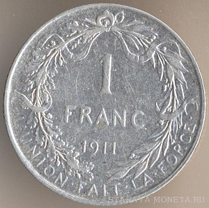1 франк 1911 года, серебро 835-й пробы, масса - 5 граммов, диаметр - 23 мм, толщина - 1,4 мм, тираж - 2810000 экземпляров. Гравёр: Годфруа Девриз. Чеканились в 1910-14 и 1917-18 годах. Тип: легенда по-французски. В обращении до 30 июля 1932 года.
