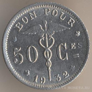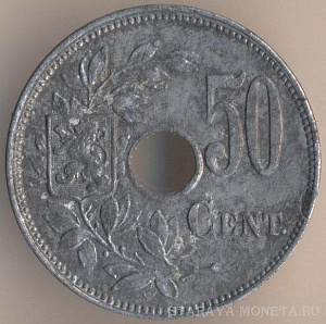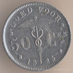 50 сантимов 1923 года, никель, масса - 2,5 грамма, диаметр - 18 мм, толщина - 1,45 мм, тираж - 15000000 экземпляров. Гравёр: Арман Боннетайн. Чеканились в 1922-23, 1928-30 и 1932-34. Тип: легенда по-фламандски. В обращении до 8 мая 1953 мая.