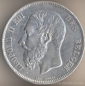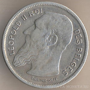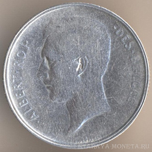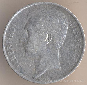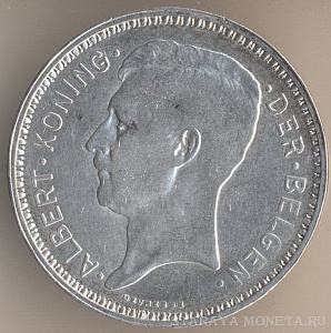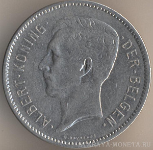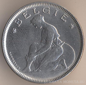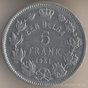 5 франков / 1 бельга 1931 года, никель, масса - 14 граммов, диаметр - 31 мм, толщина - 2,53 мм, тираж - 5336000 экземпляров. Гравёр: Александр Эверэртс. Чеканились в 1930-33. В обращении до 18 января 1951 года.