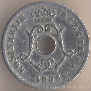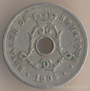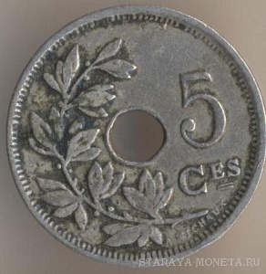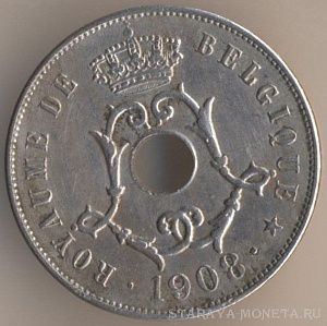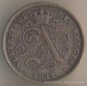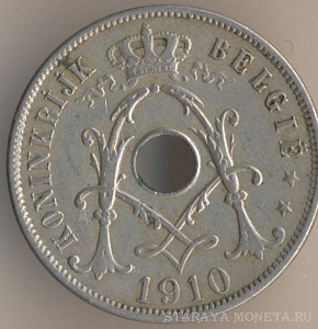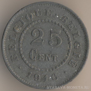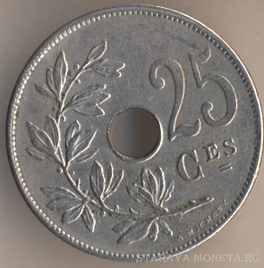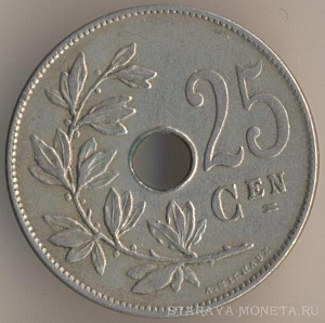 25 сантимов 1910 года, медно-никелевый сплав, масса - 6,5 грамма, диаметр - 26 мм, толщина - 1,73 мм, тираж - 2006473 экземпляра. Гравёр: Альфонс Мишо. Чеканились в 1910-11, 1913, 1921-22 и 1926-29 годах. Тип: легенда по-фламандски. В обращении до 30 января 1967 года.