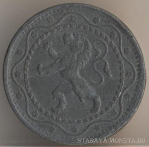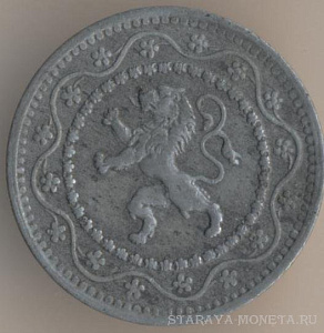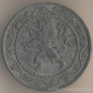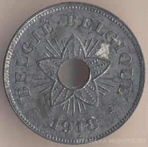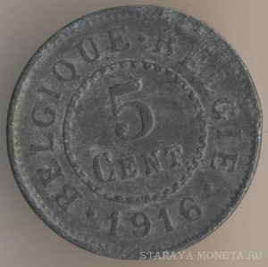 Германская оккупация. 5 сантимов 1916 года, цинк, масса - 2,5 грамма, диаметр - 19 мм, толщина - 1,61 мм, тираж - 45464000 экземпляров. Чеканились в 1915-16 годах. В обращении до 11 ноября 1923 года.