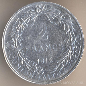 2 франк 1912 года, серебро 835-й пробы, масса - 10 граммов, диаметр - 27 мм, толщина - 2 мм, тираж - 375000 экземпляров. Гравёр: Годфруа Девриз. Чеканились в 1910-12 годах. Тип: легенда по-французски. В обращении до 30 июля 1932 года.
