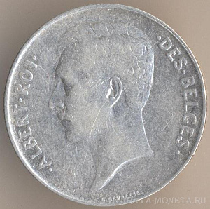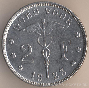 2 франка 1923 года, никель, масса - 10 граммов, диаметр - 27 мм, тираж - 6500000 экземпляров. Гравёр: Арман Боннетайн. Чеканились в 1923-24 и 1930. Тип: легенда по-фламандски. В обращении до 26 октября 1933 года.