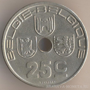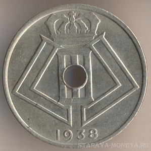 Леопольд III (1934-1951). 25 сантимов 1938 года, никель-латуневый сплав, масса - 6,5 грамма, диаметр - 26 мм, толщина - 1,65 мм, тираж - 14932000 экземпляров. Гравёр: Оскар Есперс. Чеканились в 1938-39 годах. В обращении до 1 марта 1968 года.