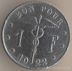 1 франк 1922 года, никель, масса - 5 граммов, диаметр - 23 мм, толщина - 1,63 мм, тираж - 14000000 экземпляров. Гравёр: Арман Боннетайн. Чеканились в 1922-23, 1928-31 и 1933-34. Тип: легенда по-французски. В обращении до 24 января 1949 года.
