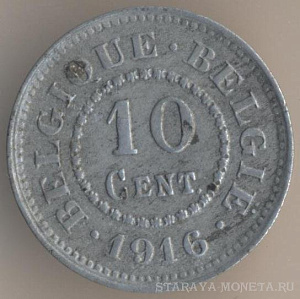 10 сантимов 1916 года, цинк, масса - 4 грамма, диаметр - 22 мм, толщина - 1,75 мм, тираж - 37392011 экземпляров. Чеканились в 1915-17 годах. В обращении до 11 ноября 1923 года.