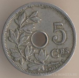 5 сантимов 1922 года, медно-никелевый сплав, масса - 2,5 грамма, диаметр - 19 мм, толщина - 1,21 мм, тираж - 12640000 экземпляров. Гравёр: Альфонс Мишо. Чеканились в 1910, 1913-14, 1920, 1922-23, 1925-28 и 1932 годах. Тип: легенда по-французски. В обращении до 29 декабря 1955 года.