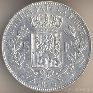 5 франков 1870 года, серебро 900-й пробы, масса - 25 граммов, диаметр - 37 мм, толщина - 3 мм, тираж - 10468075 экземпляров. Гравёр: Леопольд Вайенер. Чеканились в 1865-76 и 1878 годах. Тип: легенда по-французски. В обращении до 1932 года.