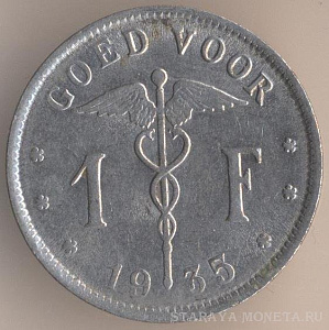 1 франк 1935 года, никель, масса - 5 граммов, диаметр - 23 мм, толщина - 1,7 мм, тираж - 2237500 экземпляров. Гравёр: Арман Боннетайн. Чеканились в 1922-23, 1928-29 и 1933-35. Тип: легенда по-фламандски. В обращении до 24 января 1949 года.