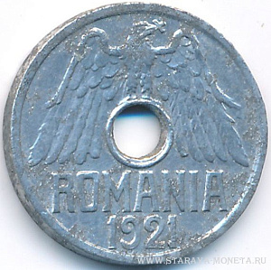 Королевство Румыния. Фердинанд I (1914-1927). 25 бани 1921 года, алюминий, масса - 0,9 грамма, диаметр - 19 мм, толщина - 1 мм, тираж - 20000000 экземпляров. Монетный двор "Huguenin" (г. Ле-Локль, Швейцария). Единственный выпуск.