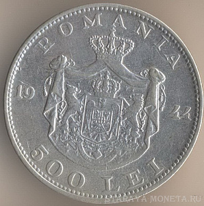 500 лей 1945 года, никель-латуневый сплав (63% меди + 37% цинка), масса - 10 граммов, диаметр - 30 мм, толщина - 2 мм, тираж - 3422000 экземпляра (хотя, согласно книге "Monetele Romaniei" под редакцией Октавиана Илиеску и Пауля Радовицы, общий тираж был несколько большим - 4942400 экземпляров). Гравёр: Хараламб Ионеску. Единственный выпуск.