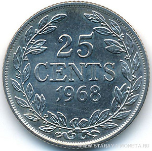 В 1966 и 1968-75 годах на монетных дворах США чеканились медно-никелевые монеты номиналом 25 центов Республики Либерия. Однако в 1988-90 годах было выпущено ещё 2 миллиона 400 тысяч монет с датой "1968". Они не имели отличий от оригинальных монет 1968 года, поэтому фактически установить, когда была отчеканена монета с указанной датой, не представляется возможным.