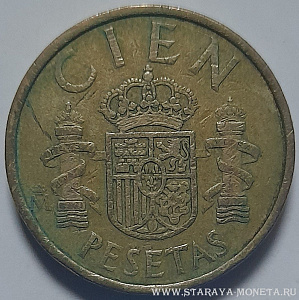 Иногда судьба монеты зависит от случайных факторов. 14 мая 1982 года был издан указ короля Испании Хуана Карлоса I № 1417/1982 о введении в обращение монет новой металлической системы. В частности, речь шла о новом типе монет достоинством 100 песет, призванном снизить производственные расходы, поскольку выпуск медно-никелевых монет данного номинала, чеканившихся ранее, стал совершенно нерентабельным, да и большой размер (34 мм, 17 граммов) делал их неудобными в повседневном обращении. Согласно новому стандарту, монета в 100 песет должна была чеканиться из сплава меди (88,4%), никеля (5%), алюминия (5%), железа (1%) и марганца (0,6%). Размеры её тоже уменьшались до вполне удобных 24,5 мм и 9,25 грамма. 15 сентября 1982 года первые монеты нового типа поступают в обращение и сразу же завоёвывают популярность среди населения. В дальнейшем они выпускались ежегодно огромными тиражами по 1990 год включительно. Чеканилась бы они и далее, но в дело вмешался непредвиденный фактор - к концу 1980-х годов Испания стала чрезвычайно популярной среди европейских и американских туристов, подавляющее большинство которых не говорило на языке Сервантеса. Возникла проблема: многочисленные туристы не могли понять номинала монеты достоинством сто песет, поскольку он указывался не цифрами, а испанским словом "СIEN" ("СТО") . Дабы избежать недоразумений, Министерство финансов 31 августа 1990 года издало приказ, в соответствии с которым в дальнейшем номинал монет следовало указывать цифрами. Это положило конец чеканке монеты в 100 песет образца 1982 года.