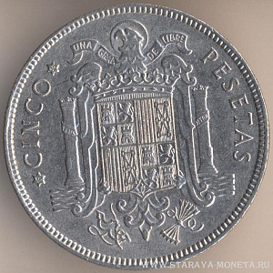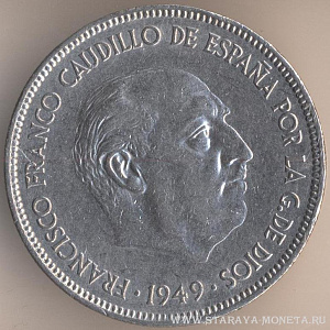 В 1949-1951 годах в Испании чеканилась крупная (диаметр - 32 мм, масса - 15 граммов) монета достоинством 5 песет с портретом каудильо Франсиско Франко. Первоначально предполагалось, что она будет изготавливаться из серебра, однако к моменту выпуска покупательная способность данного номинала уже существенным образом не соответствовала стоимости благородного металла. Как следствие, было принято решение о чеканке монеты из никеля, что и было сделано. Но и здесь нашла коса на камень - два года спустя цены на никель сильно выросли и чеканка стала совершенно нерентабельной. Таким образом, монета выдержала всего три тиража, пала жертвой инфляции и была выведена из обращения 1 марта 1958 года.