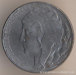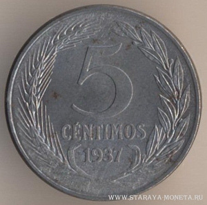 Монета испанского республиканского правительства номиналом 5 сентимо, отчеканенная в 1937 году, традиционно относится к продукции Мадридского монетного двора. На самом деле, это не вполне верно. В Испании шла гражданская война (1936-1939) и положение столицы было шатким. Поэтому монетный двор был переведён в город Кастельон-де-ла-Плана, расположенный в Валенсии (позже его эвакуируют в город Аспе той же провинции). Представленная монета была отчеканена в период нахождения Мадридского монетного двора в Кастельоне-де-ла-Плана.