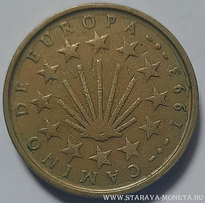 А что там "скрытого"-то ? Никакой "расшифровки" не надо, надо просто прочитать надпись на монете: там так и написано: "Camino de Santiago", это (Гугл в помощь) "«Путь Святого Иакова», паломническая сеть маршрутов, ведущих к предполагаемой гробнице апостола Иакова"
