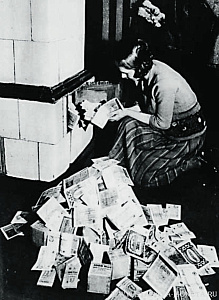 Осенью 1923 года инфляция в Веймарской Республике достигла феерического показателя в 3 миллиона 200 тысяч процентов в месяц. На банкнотах появлялось всё больше нолей (дошло до выпуска купюры в 100 триллионов марок), но, они, всё равно, не поспевали за катастрофическим ростом цен. Как следствие, наступил период, когда бумажные дензнаки стали использовать для отапливания помещений, поскольку это было выгоднее, чем покупать уголь и дрова...