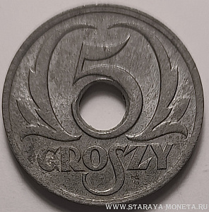 Цинковая монета достоинством 5 грошей, отчеканенная немецкими оккупационными властями в годы Второй Мировой войны, имеет на реверсе дату "1939". Её дизайн был заимствован у бронзовой монеты аналогичного достоинства, чеканившейся в 1923-1939 годах (разработана скульптором Войцехом Ястжебовским). Однако фактически чеканка производилась в 1943 и 1944 годах. По окончании войны монета не была изъята из обращения и признавалась законным платёжным средством вплоть до 30 октября 1950 года.