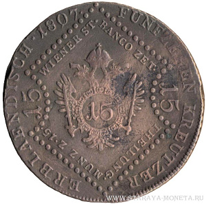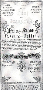 В 1762 году в Австрии был начат выпуск, так называемых, банкоцеттелей - государственных облигаций, которые можно было использовать в качестве банкнот. Первая эмиссия составила 12 миллионов гульденов, но в дальнейшем выпуск банкоцеттелей был поставлен на поток и к началу XIX века общая их сумма достигла 100 миллионов гульденов и продолжала расти. Как следствие, эти банкноты обесценивались и, при формальном паритете с монетой, фактически, стоили значительно меньше (к 1813 году за 1 серебряный гульден давали 13 гульденов банкоцеттелями - это было связано с безудержной эмиссией ничем не обеспеченных бумажных денег, объём которых приблизился к миллиарду гульденов). Как следствие, австрийская экономика столкнулась со значительной инфляцией и была подорвана. Чтобы как-то исправить положение, имперские власти в 1807 году выпустили медные монеты достоинством 15 и 30 крейцеров, на которых была выбита надпись "Bancozetteltheilu XXX munze" ("монета для исцеления банкоцеттелей") - однако вливание в экономику большого количества медной монеты не помогло стабилизации денежной системы. Банкоцеттели продолжали обесцениваться, пока не были окончательно выведены из оборота в 1816 году. Примечание: изображение бумажного банкоцеттеля взято из Википедии.