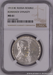 На аукцион выставляется Рубль 1913 ВС "В память 300-летия Дома Романовых".Монета в слабе NGC MS61